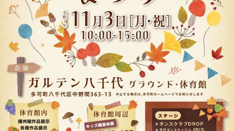 11月3日に、ガルテン八千代グラウンド周辺にて「第20回多可町ふれあいまつり」が開催されます。