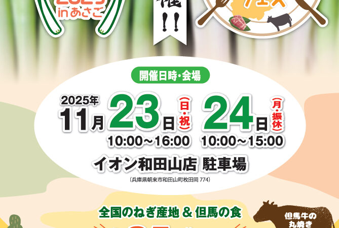 同時に、岩津ねぎをはじめ市の特産品や但馬ブランドの逸品が勢ぞろいする「食」の祭典「あさごうまいもんフェス」も開催。販売や飲食ブースが立ち並び、地元の味覚を存分に楽しめます。