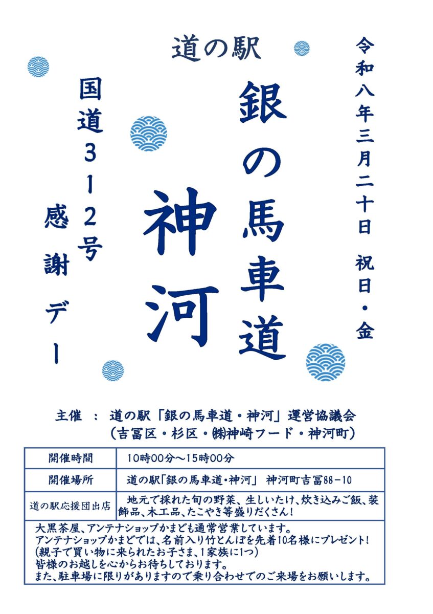 3月20日に、道の駅「銀の馬車道・神河」にて「国道312号感謝デー」が開催されます。