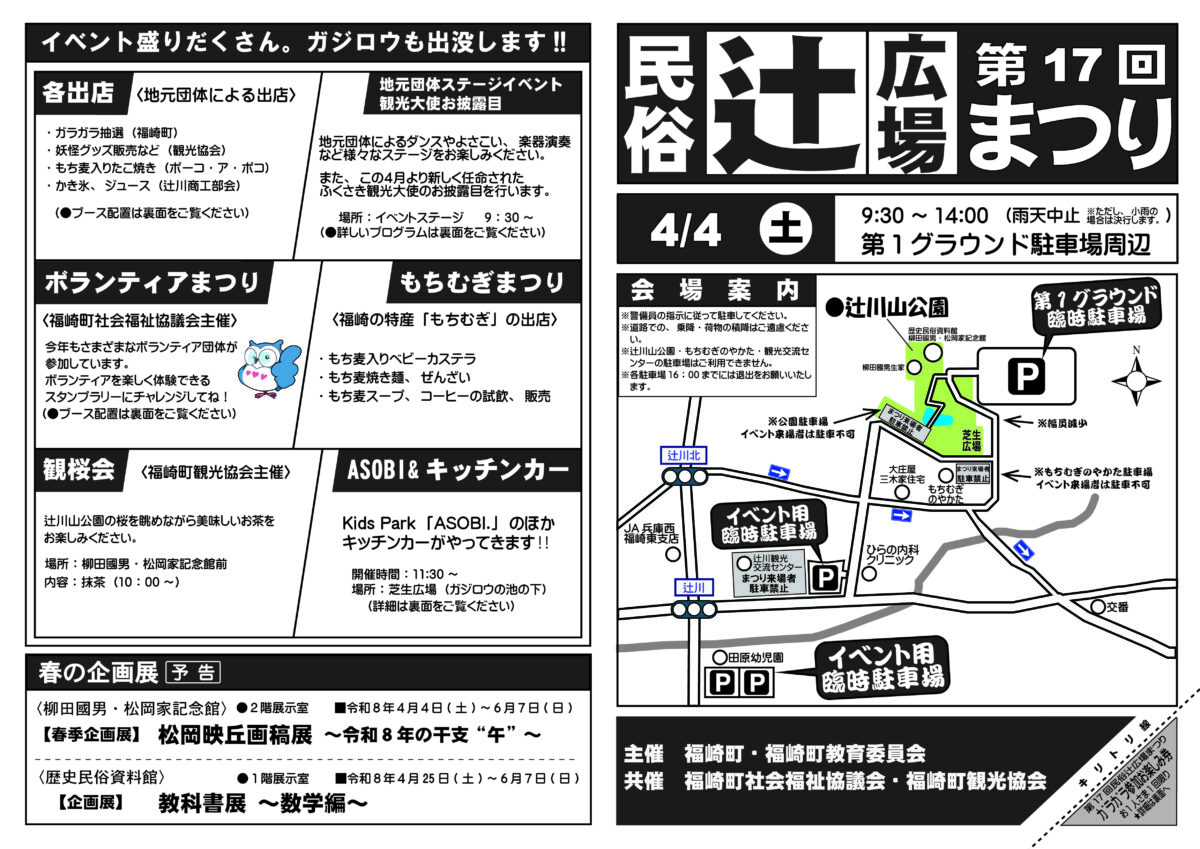 4月4日(土)に、辻川山公園にて民俗辻広場まつりが開催されます。