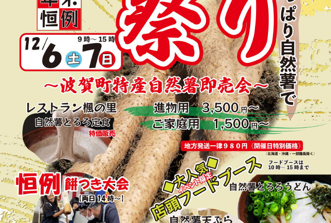 12月6日・7日の2日間、道の駅みなみ波賀にて「自然薯まつり」が開催されます。