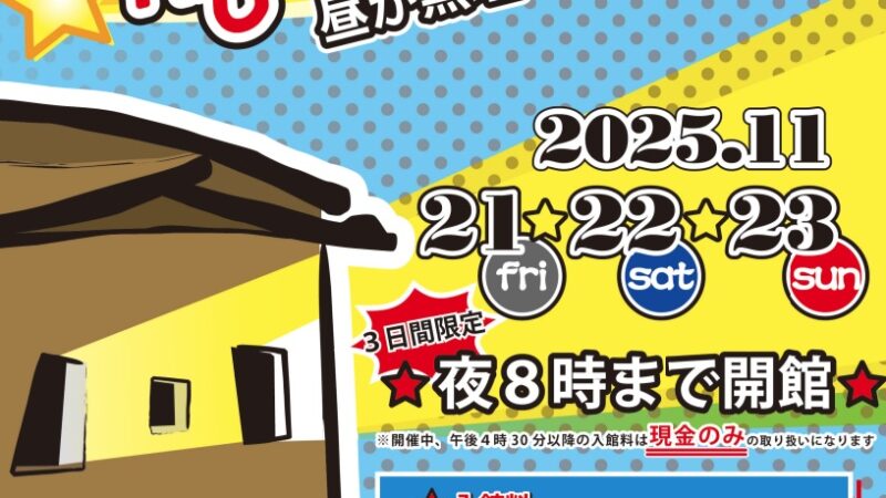 令和7年11月21日(金曜日)から23日(日曜日)までの3日間限定で、「書写の里・美術工芸館ナイトミュージアム -昼が無理なら夜に来て!-」と題し、夜8時まで開館時間が延長されます。