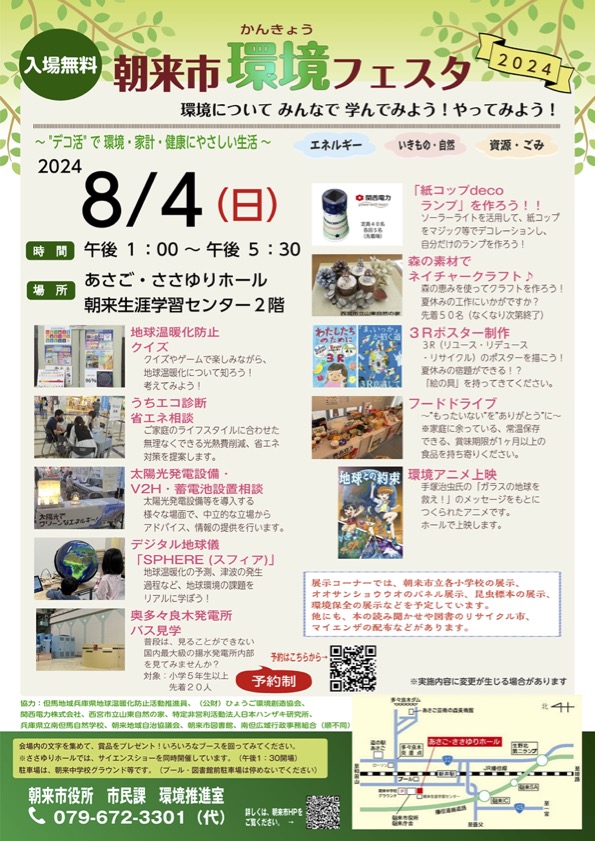 朝来市では、地球温暖化防止、循環型社会の形成、自然環境の保全等の環境問題に対する理解を深め、環境保全の意識の高揚や行動変容、ライフスタイルの転換につなげることを目的に、エネルギーやいきものやごみに関する環境問題について楽しみながら学び考えることができる参加・体験型のイベントを開催します。
