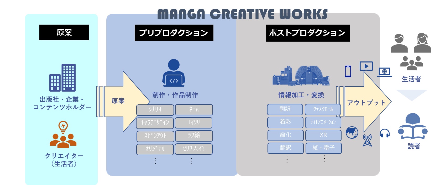 マンガを多言語で制作、スマートフォンの画面に適した縦にスクロールするマンガへの変換・制作、コンテンツのカラー化などにも対応。