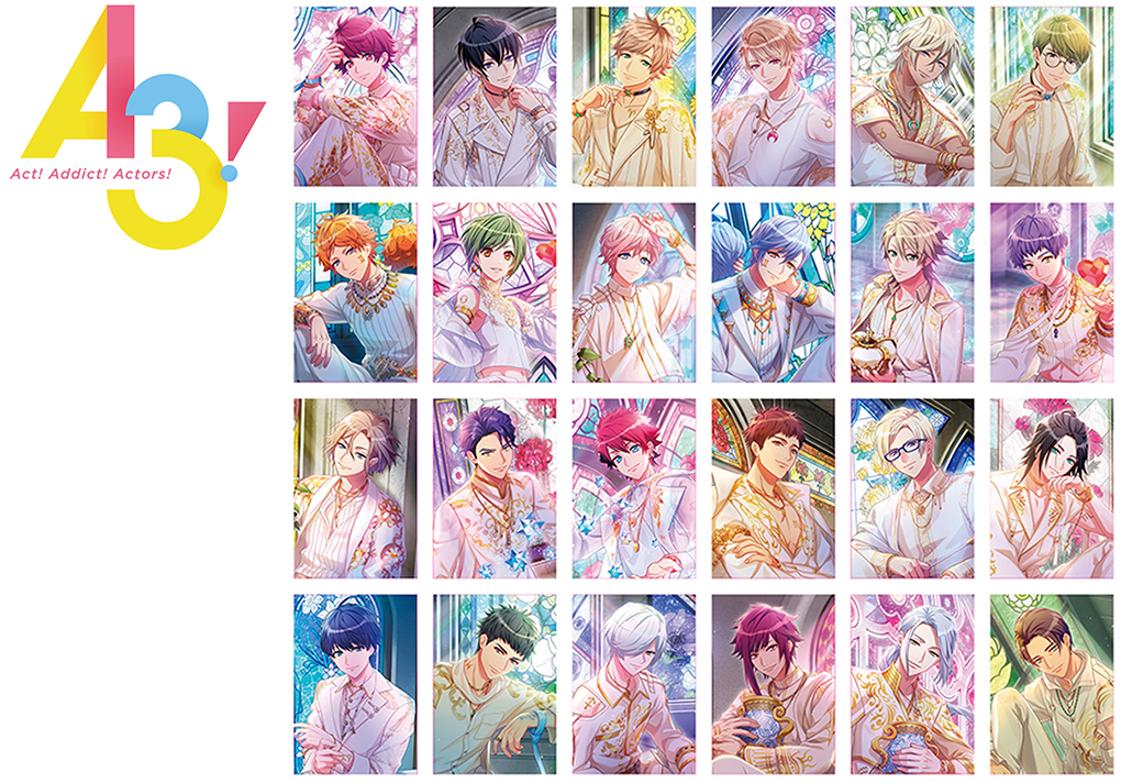 全国アニメイト・アニメイト通販にて6月11日~7月10日まで開催される「咲きほこれ!『A3!』フェア inアニメイト」では、期間中、『A3!』関連のキャラクターグッズ・書籍をご購入1,100円(税込)毎、またはCD・Blu-ray・DVDをご購入1点毎に、特典「ラメ入りキラキラミニカード(全24種)」がランダムで1枚プレゼントされます。特典絵柄はゲーム内カード【満開Glitter】の開花後イラストが使用されています。