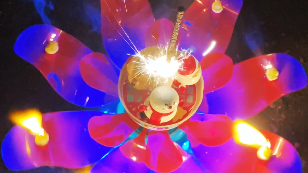 開花と同時に花弁に付けられたローソクにも着火。なかなかに派手な演出。