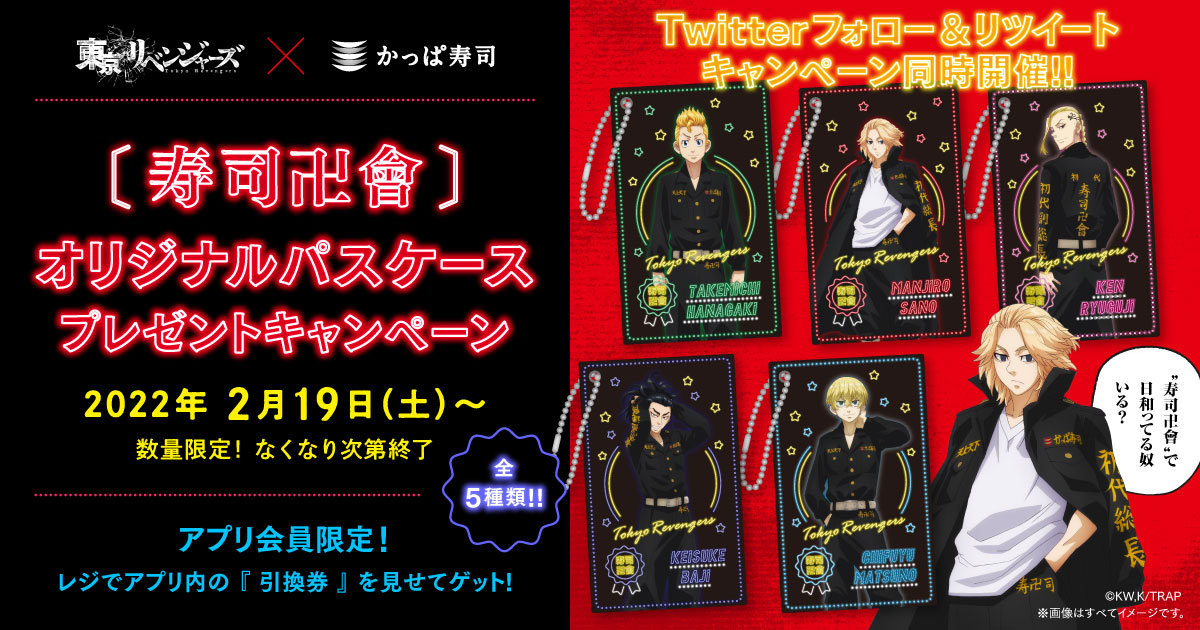 コロワイドグループのかっぱ寿司と、大人気TVアニメ「東京リベンジャーズ」(略称「東リべ」)がコラボレーションし、2022年2月19日(土)より、かっぱ寿司全店にて、アプリ会員限定「寿司卍會」のオリジナルパスケースプレゼントキャンペーンが実施されます。