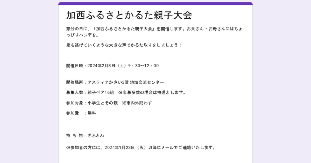 節分の日に、「加西ふるさとかるた親子大会」を開催します。お父さん・お母さんにはちょっぴりハンデを。鬼も逃げていくような大きな声でかるた取りをしましょう!開催日時...