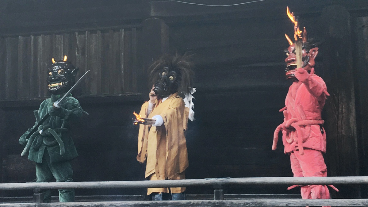 正を修め、邪を払う意味をもち、神積寺の本尊薬師如来の使者「山の神」と家来の「青鬼」(文殊菩薩)「赤鬼」(毘沙門天)が邪気を払う所作を行います。