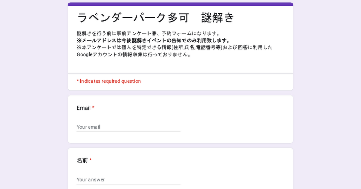 謎解きを行う前に事前アンケート兼、予約フォームになります。※メールアドレスは今後謎解きイベントの告知でのみ利用致します。※本アンケートでは個人を特定できる情報(...