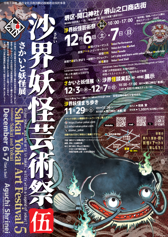 この伝承を基軸に、2025年も「沙界妖怪芸術祭・伍」を開催。12月6日(土)・7日(日)は開口神社と堺山之口商店街で妖怪パフォーマンスやマーケットを展開し、12月3日(水)〜7日(日)は「さかいと妖怪展」を開口神社客殿で実施します。