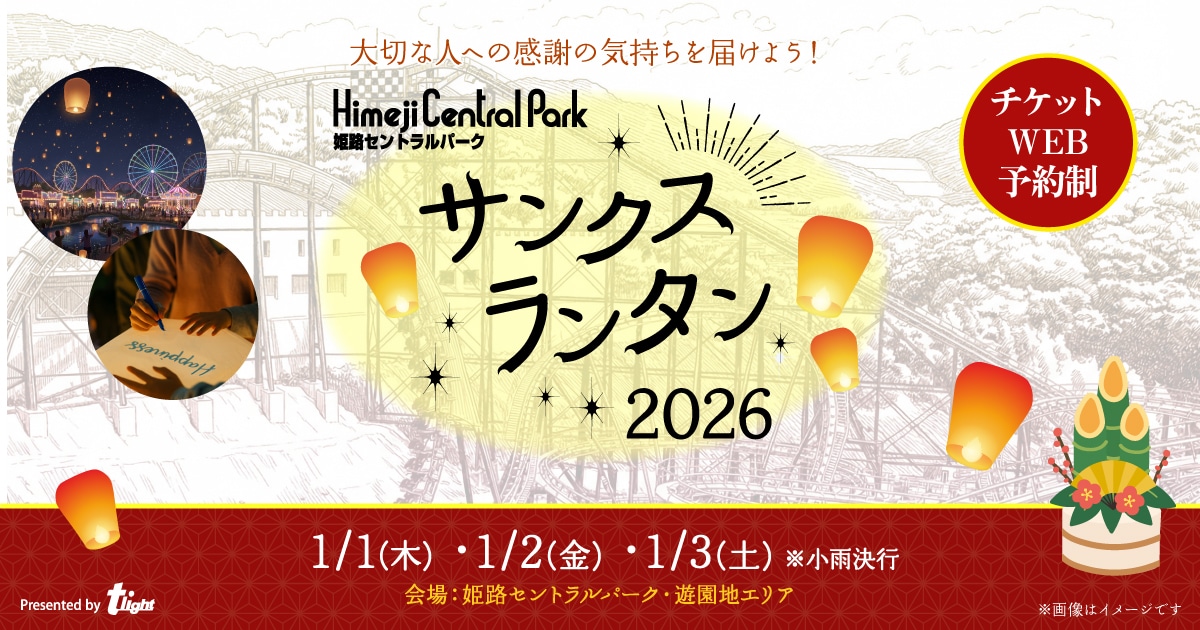 2026年1月1日(木)、2日(金)、3日(土)のお正月3日間限定で熱気球型LEDランタンを打ち上げる『サンクスランタン2026』が姫路セントラルパークの遊園地エリアで開催されます。