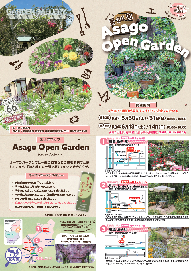 朝来市にて「第24回 あさごオープンガーデン」が開催されます。市内の一般家庭や地域の庭を無料で公開し、色とりどりの花や緑を楽しめる人気イベントです。