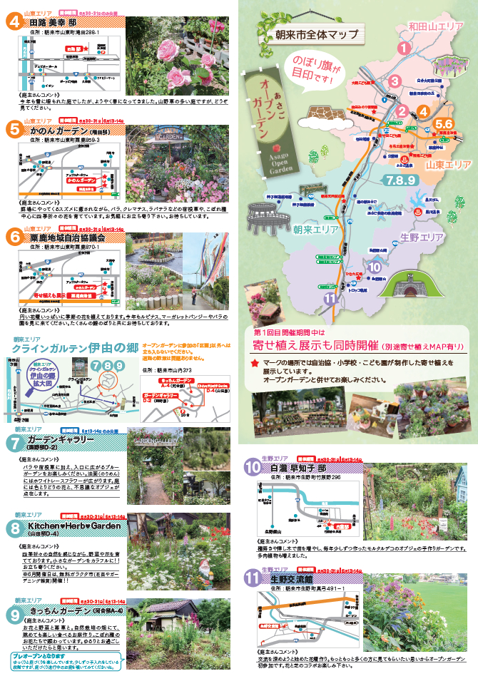 | 場所 | ・庭の公開 朝来市内の11ヶ所 ・寄せ植え展示 朝来市内の9ヶ所 ※寄せ植え展示は第1回目の公開時のみ |