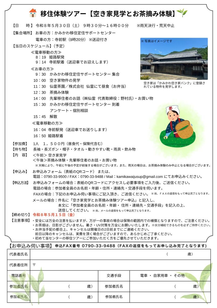 神河町にて、移住を検討している方を対象とした体験型イベント「空き家見学とお茶摘み体験ツアー」が5月30日に開催されます。