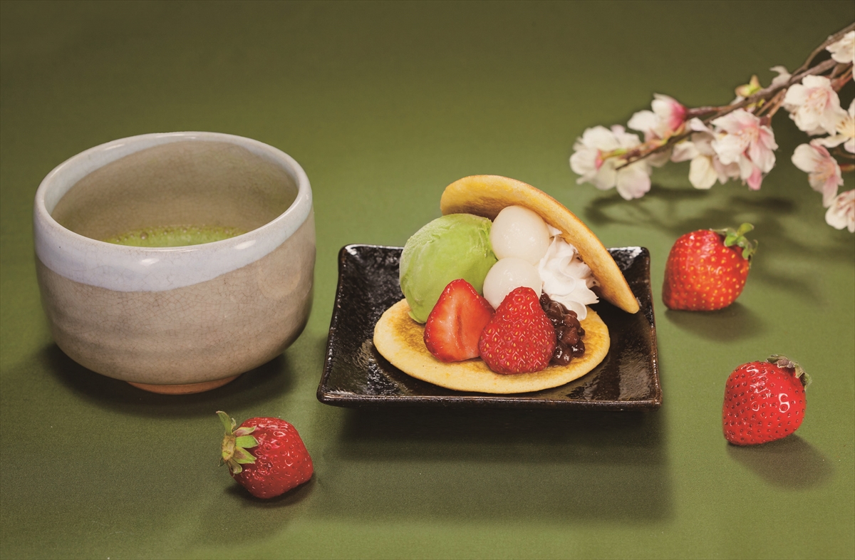 厳選素材を贅沢に使用する「KURA ROYAL」。今回は、京都府産の宇治抹茶を贅沢に使った2種類のお抹茶スイーツが新登場します。「お抹茶アイスどらやき」は、1枚1枚丁寧に焼き上げ、もっちり食感にこだわった生地の間に、抹茶アイス、ホイップ、あずき、白玉、イチゴを盛り付け、まるでパフェを彷彿させるようなボリューム満点のスイーツです。