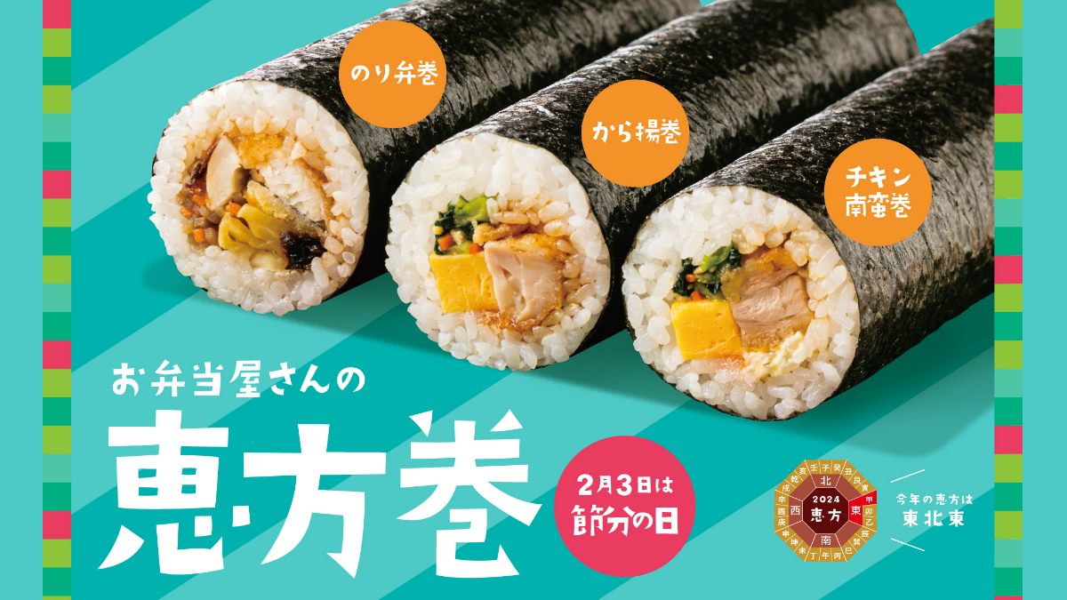 人気の弁当メニューを恵方巻にした「ほっともっと」の恵方巻は、『のり弁当』のいつもの美味しさをそのまま巻いた『のり弁巻』450円、から揚・だし巻玉子・桜でんぶ等を巻いた食べ応え抜群の『から揚巻』550円、甘酸っぱいチキン南蛮と具だくさんのタルタルソースがたまらない『チキン南蛮巻』550円の3種が登場します。