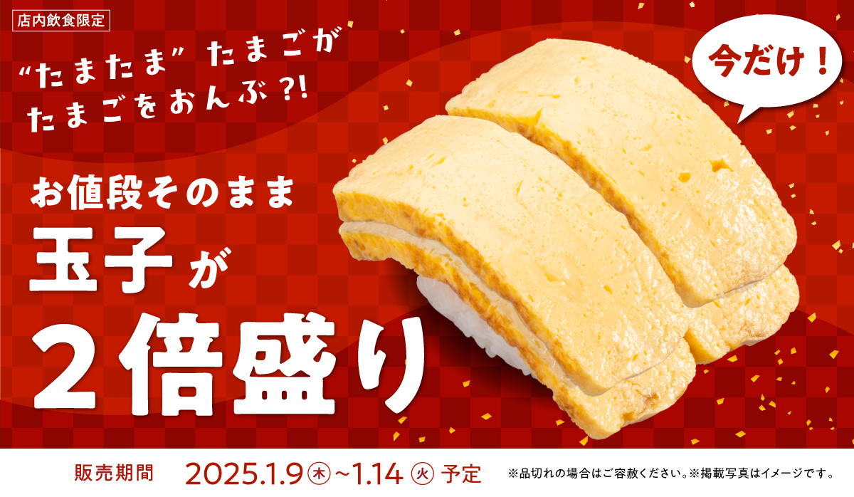 通常は一貫に一枚を乗せて提供されている『玉子』のネタがお値段そのままで、2倍になって登場!お子様から大人まで大人気の商品が今だけお得に楽しめます。