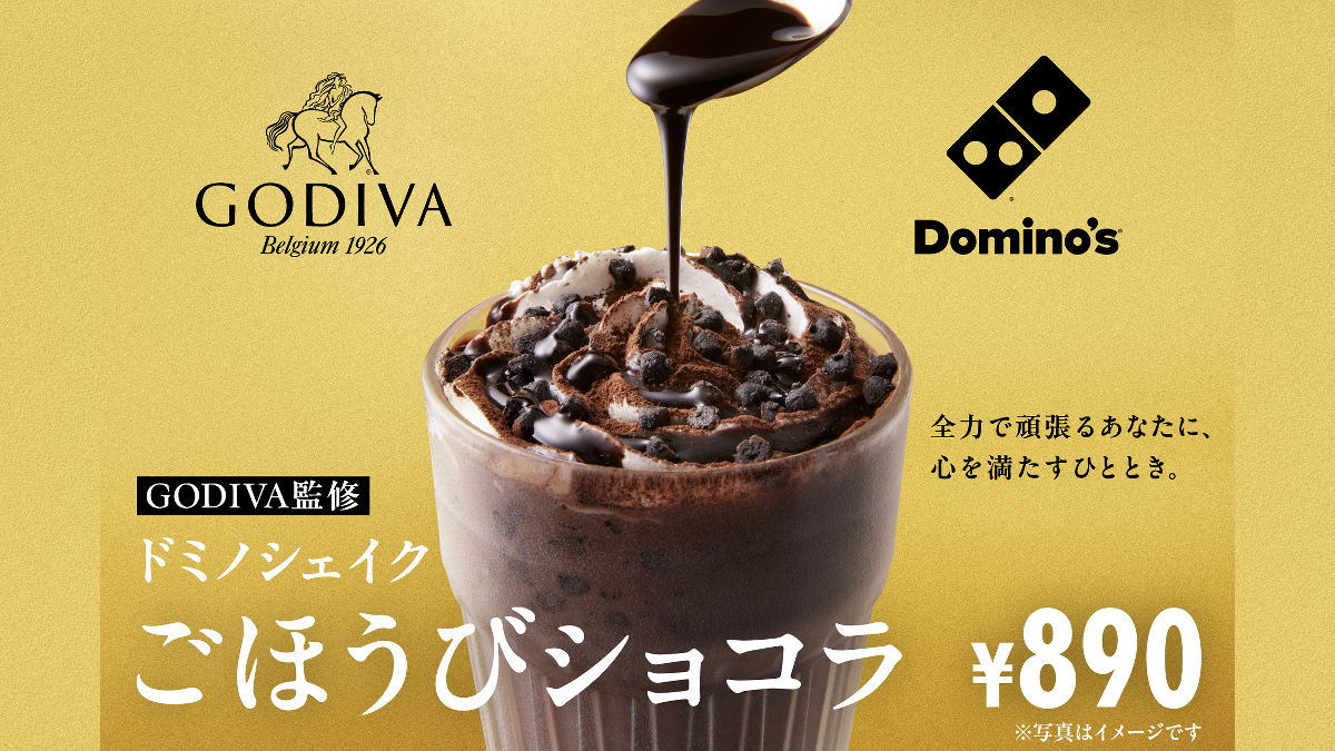 これまでに620万杯以上売り上げた大人気メニュー「ドミノシェイク」を、世界中で愛されるプレミアムチョコレートブランド「ゴディバ」が監修。「GODIVA監修 ドミノシェイクごほうびショコラ」は、「ドミノシェイク」のおいしさをそのままに、香り高いココアをふんだんに使用した、チョコレート好きにはたまらない濃厚かつ贅沢なゴディバ監修のシェイクです。