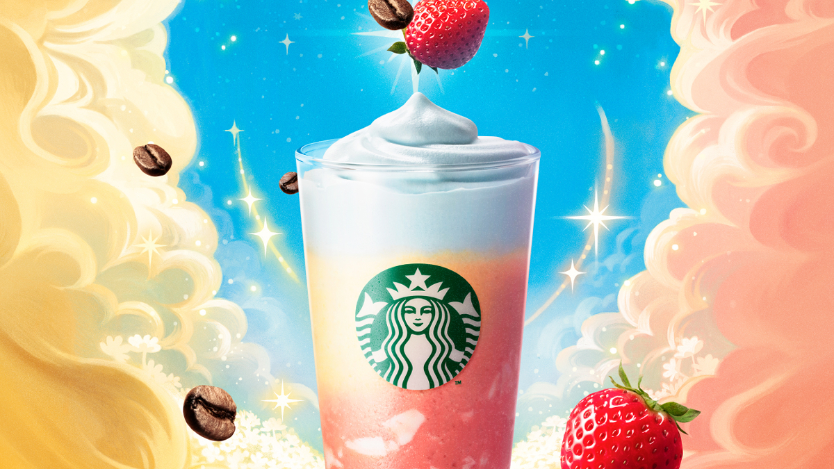 1杯で2つの味が楽しめる!ストロベリー風味のボールで味が変化する新体験『春空 ミルクコーヒー フラペチーノ®』が登場