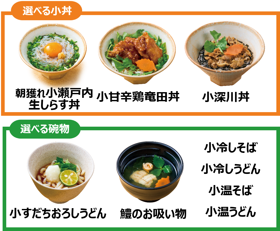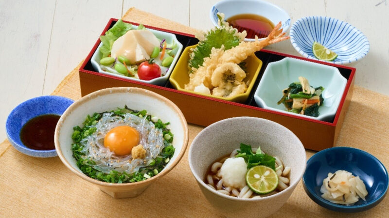 選べる小丼・椀物、3種の小鉢がセットになった、瀬戸内の恵みを堪能できる夏にぴったりな御膳です。朝獲れの生しらす丼やすだちおろしうどん、瀬戸内産の鱧・上海老・大葉の天ぷらにも徳島県産すだちを絞ってさっぱりとお召し上がりいただけます。自家製おぼろ豆富を使用したサラダなど、小鉢も夏らしいラインアップです。