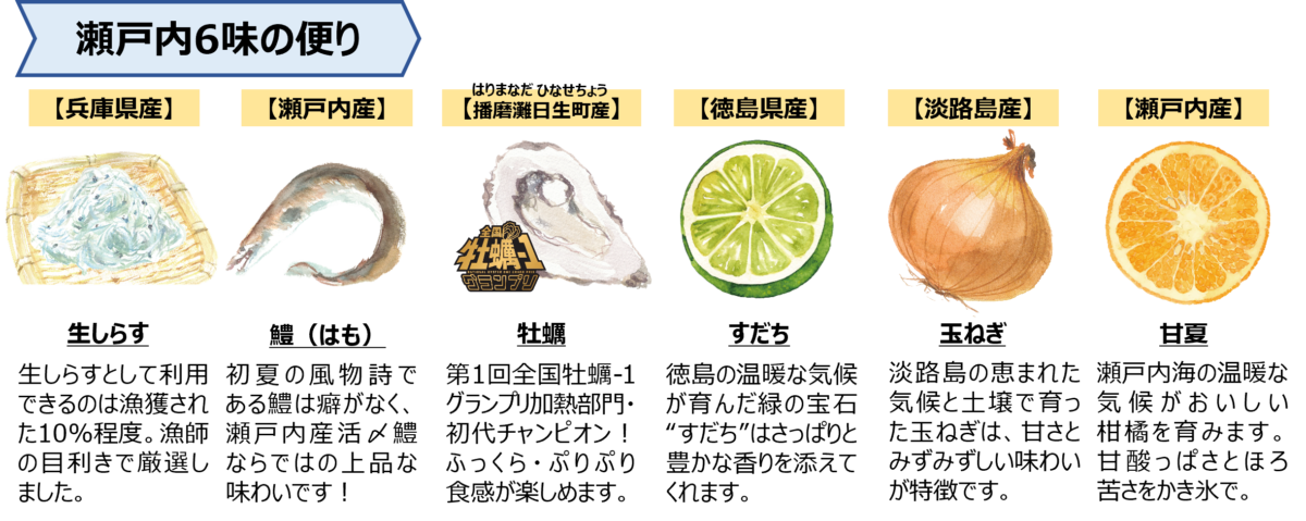 ①兵庫県産生しらす、瀬戸内産鱧(はも)・播磨灘日生町(はりまなだひなせちょう)産牡蠣など瀬戸内食材が集結!