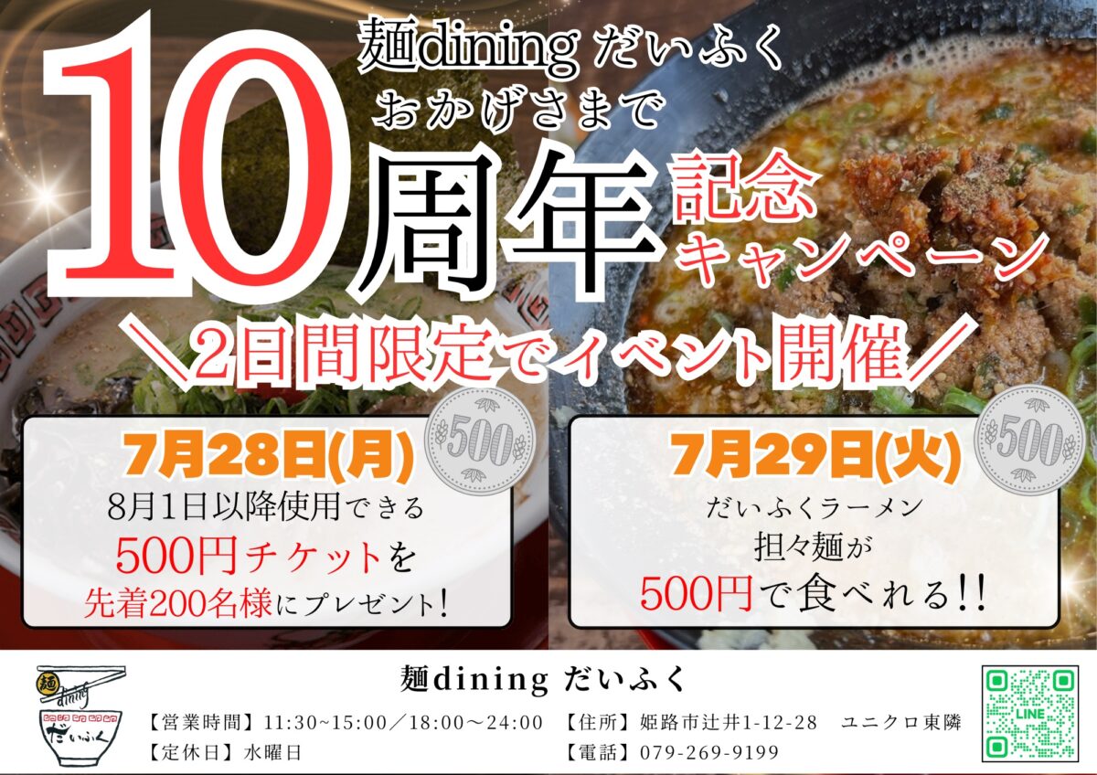兵庫県姫路市にあるラーメン店「麺 dining だいふく」が、おかげさまで10周年。これを記念して、7月28日(月)と29日(火)の2日間限定で、お得なキャンペーンイベントが開催されます。