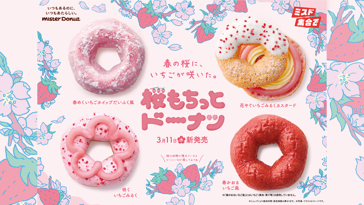 ミスタードーナツから、桜風味のもちっとした食感の生地に、今年もいちご味との組み合わせが春らしいミスタードーナツ春の定番商品『桜もちっとドーナツ』全4種が3月11日(水)から期間限定で発売。