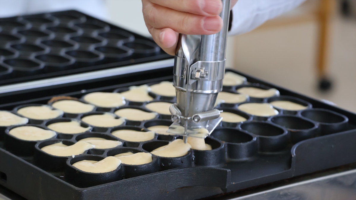 熟練の焼き技: 専用の焼き機に生地を流し込み、ぷっくり膨らんだ絶妙なタイミングで、一本のピックを使って鮮やかにひっくり返していきます。