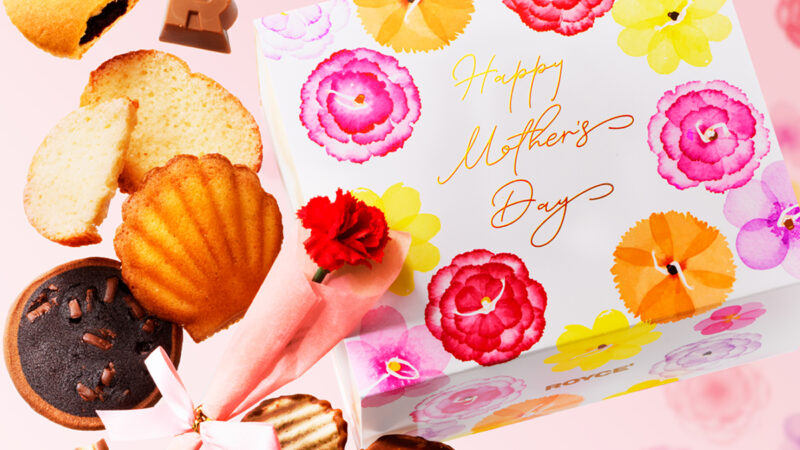 ポテトチップチョコレートをメインに、バラエティ豊かな焼き菓子やチョコレート菓子を詰め合わせた華やかなアソートボックス・LINEギフト限定「ロイズバラエティギフトボックス」に、母の日専用スリーブをセット。スリーブには、「Happy Mother’s Day」の文字とカーネーションなどの花がデザインされています。
