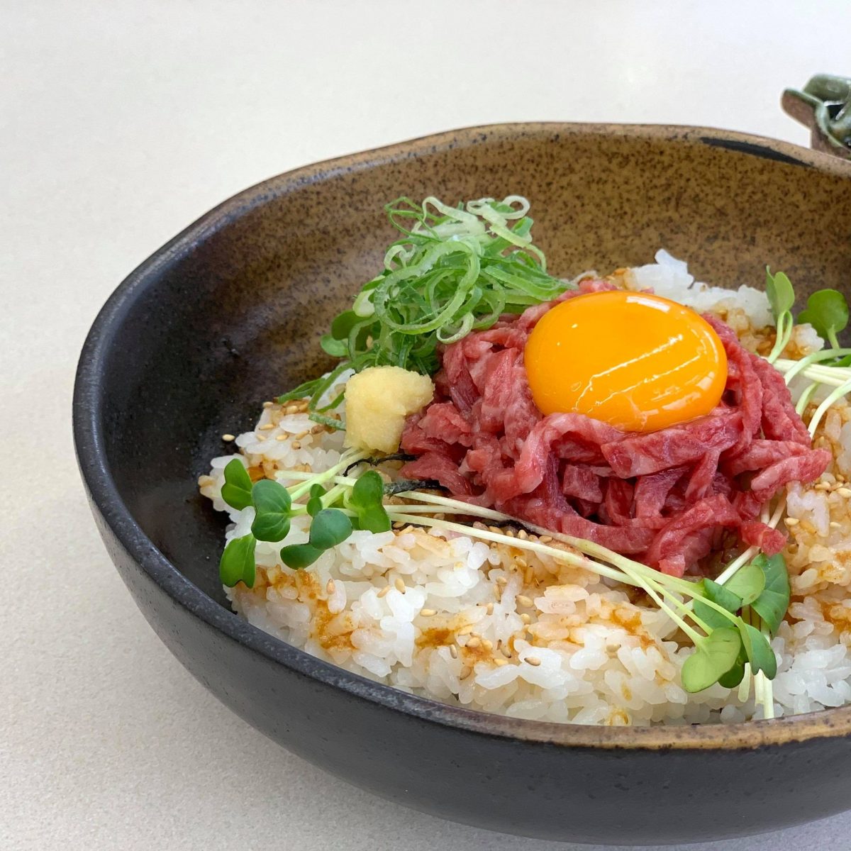 但馬牛のユッケと、とろとろの黄身が絡まる一品。