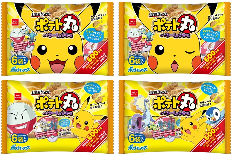 ポケモンデザインのパッケージには、ピカチュウやイーブイ、エースバーンなどおなじみのポケモンに加えて、コロコロッとしたまるいカタチがかわいいポテト丸にちなんで名前に“マル”がつくポケモンも登場!食べきりサイズの個包装が6袋入ったマルチパックの外装デザインは全4種類、個包装のデザインは16種類!