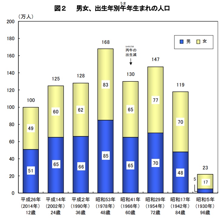 これは「丙午(ひのえうま)の年に生まれた女の子は気性が激しい」という昔からの迷信を気にして、この年の出生数がガクッと減ったからなんです。
