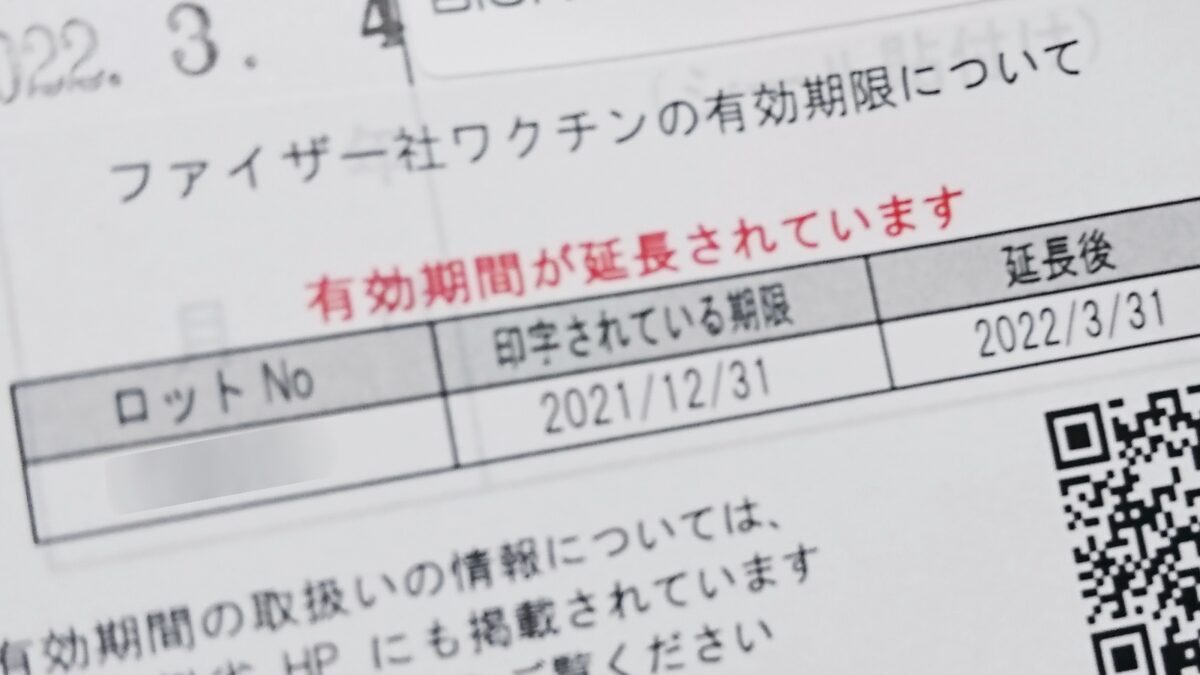 印字されている期限は「2021/12/31」ですが、「2022/3/31」と3ヶ月有効期限が延長になっていますが、接種後に分かったもので特に説明はなかったのだとか。