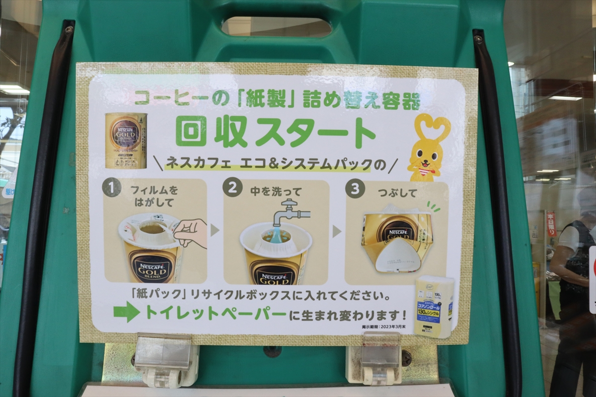 コープこうべでは、“ものの命を大切に”のキャッチフレーズのもと、ごみの削減と資源の有効利用を目的に1990年から牛乳パックのリサイクル回収をスタートし、現在では、店舗で8品目、宅配で4品目の容器包装・資源物の回収をされています。この度、ネスレ日本とコープこうべが手を組み、店頭の「紙パック回収ボックス」で「ネスカフェ エコ&システムパック」を回収し、トイレットペーパーの原料の一部としてリサイクルする取り組みを開始。