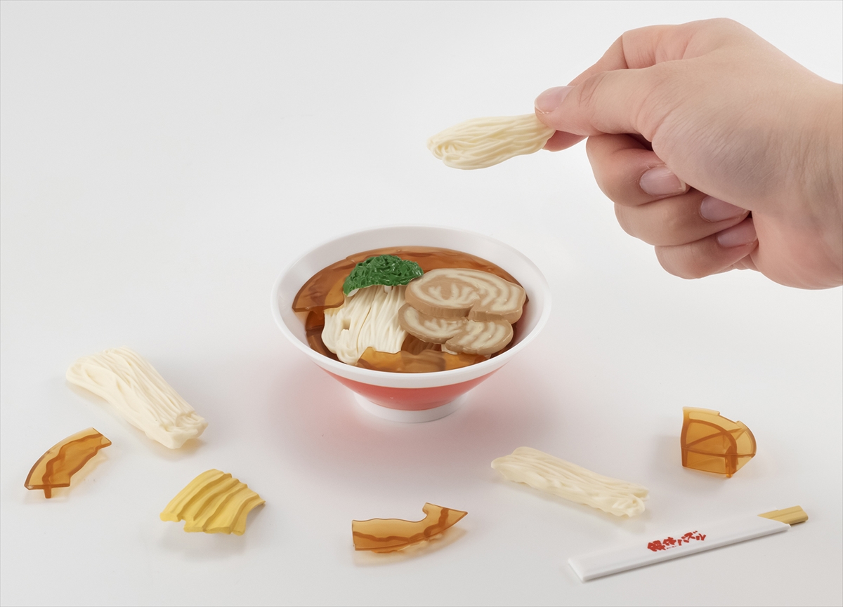 あわせて、どんぶりに入れていく流れもスープ・麺・スープ・具の順になり、一般的なラーメン作りの工程を想像しながら楽しめるように造形にこだわりました。完成した醤油ラーメンは、付属のおぼんシートと割り箸でお店のラーメンのように飾ることもできます。