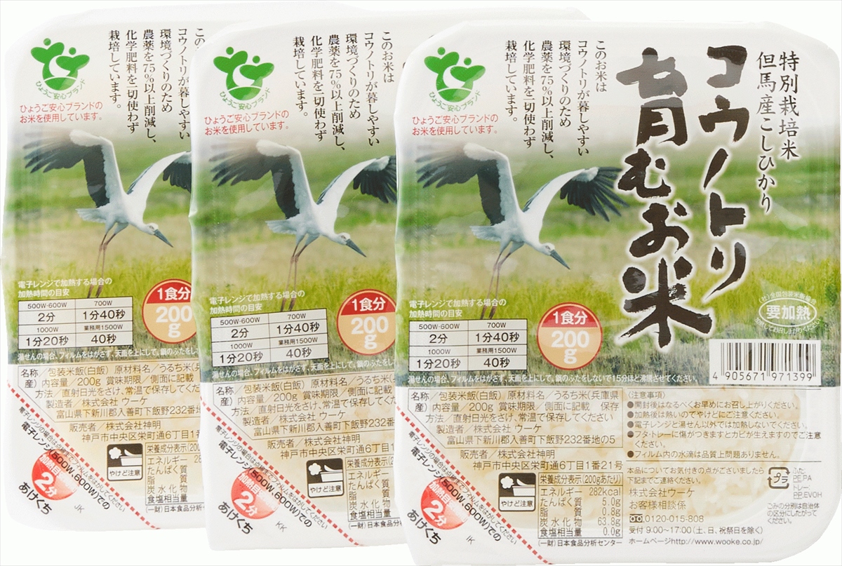 | 兵庫米パックごはん | 兵庫県但馬産の特別栽培米コシヒカリ「コウノトリ育むお米」を使用したパックごはんをお楽しみいただけます。 このお米は「コウノトリ育む農法」で育てられたお米です。電子レンジで約2分で簡単にお召し上がりいただけます。 |
