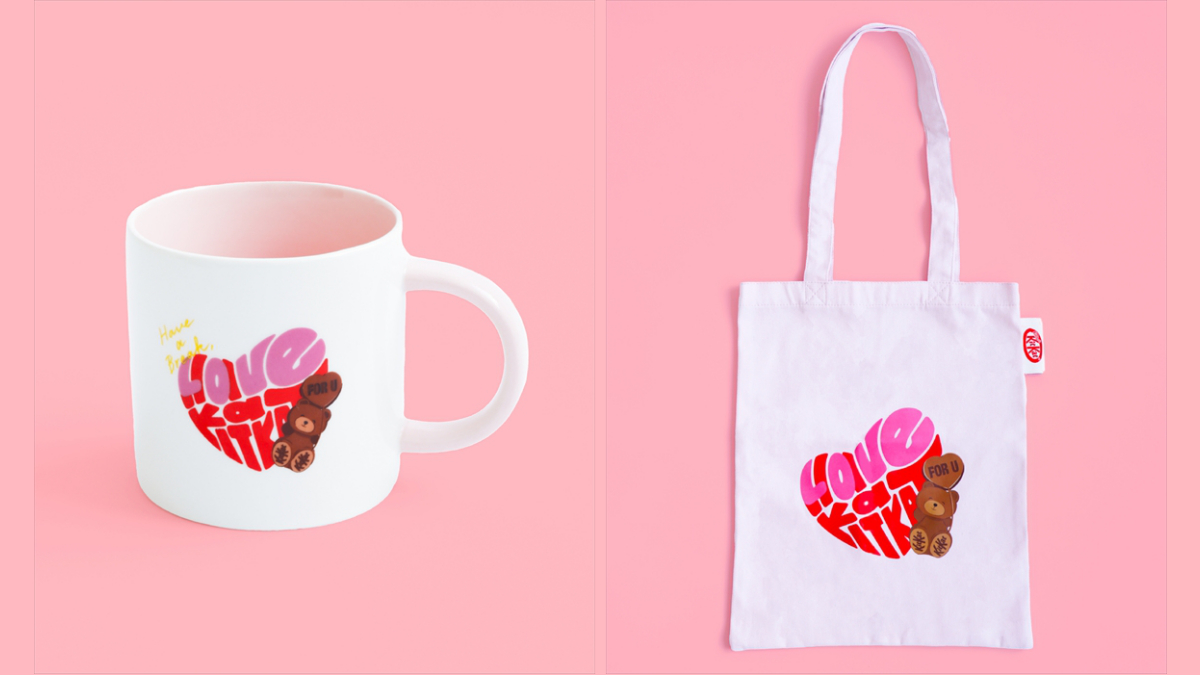 本グッズは、毎日の生活で使いやすいマグカップや巾着袋、トートバッグ、ハンカチなどの雑貨品に、「キットカット ハートフルベアー」の可愛らしいデザイン。