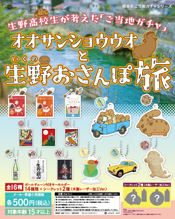9月29日に開催されるの生野「銀谷祭り」にて、生野高校生とコラボしたご当地ガチャ「オオサンショウウオと生野おさんぽ旅」が設置されます。高校生が描いたかわいいイラストにも注目です!