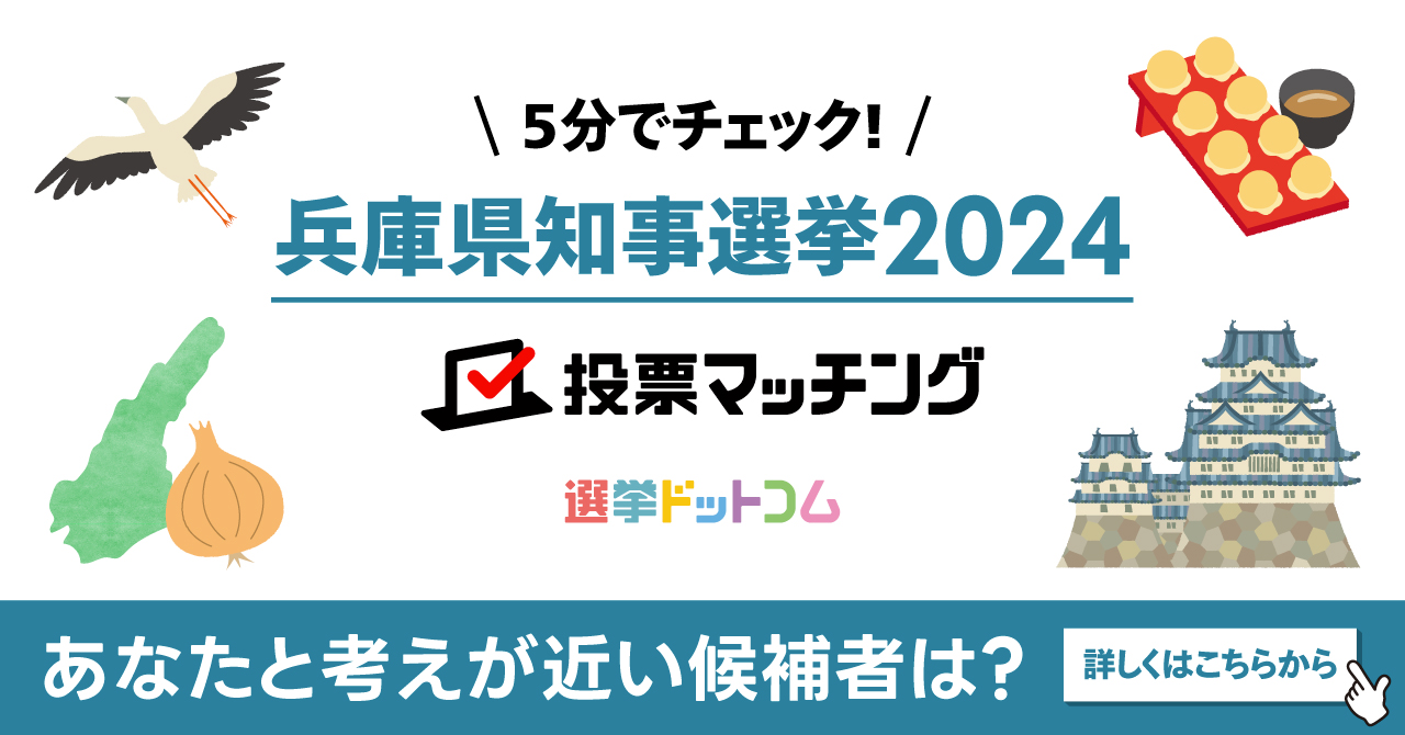 「兵庫県知事選挙2024投票マッチング」では、前知事の県政への評価や、県庁舎の縮小、県立大の無償化など兵庫県政に関係する設問への賛否を回答していくと利用者と立候補者との政策に関する「マッチング度」が測定できるサービスです。投票先を選ぶ際の参考情報としてご活用ください。