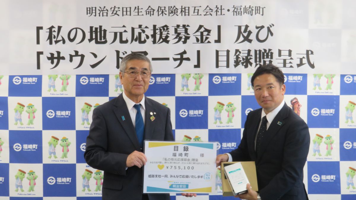 今回、福崎町に贈られたのは、明治安田生命グループの「私の地元応援募金」として、755,100円という心温まる寄付金です。