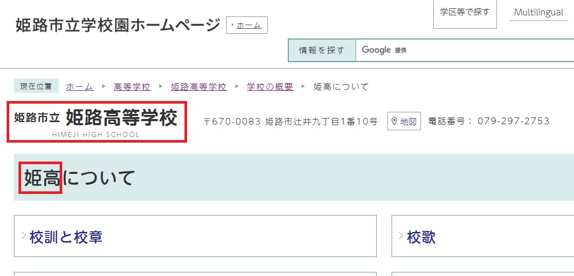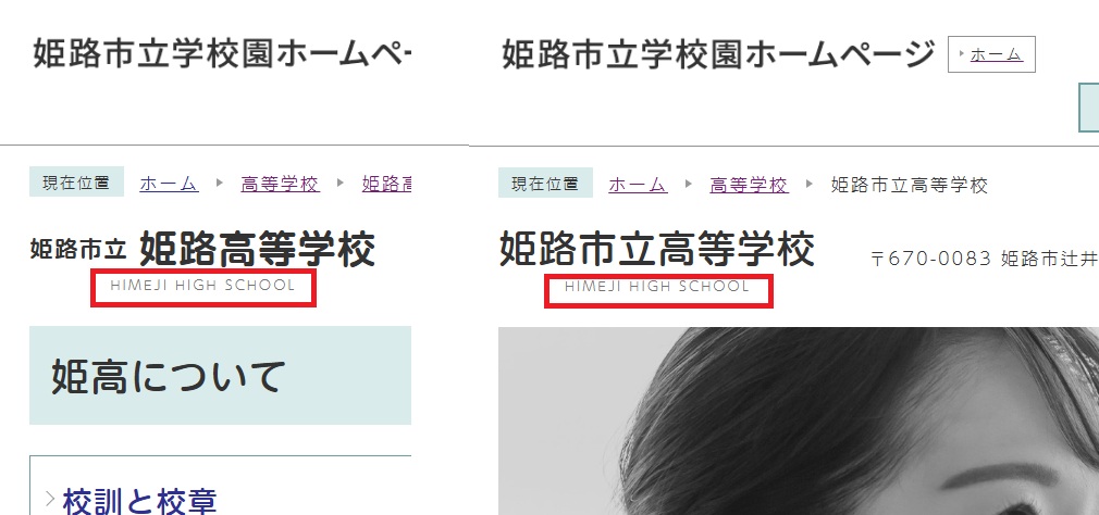 ただ、英語表記を見てみると「姫路市立姫路高等学校」と「姫路市立高等学校」ともに「HIMEJI HIGH SCHOOL」。