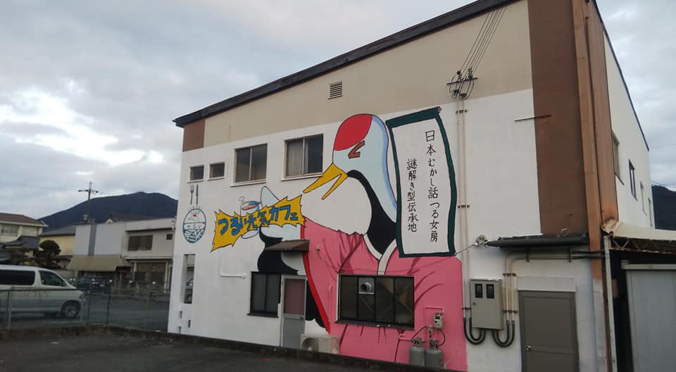 外壁補修と合わせて、香寺高等学校美術工芸部と鶴居中学校生徒会が協力して、昔話の「鶴女房」をデザインした壁画が完成しました。