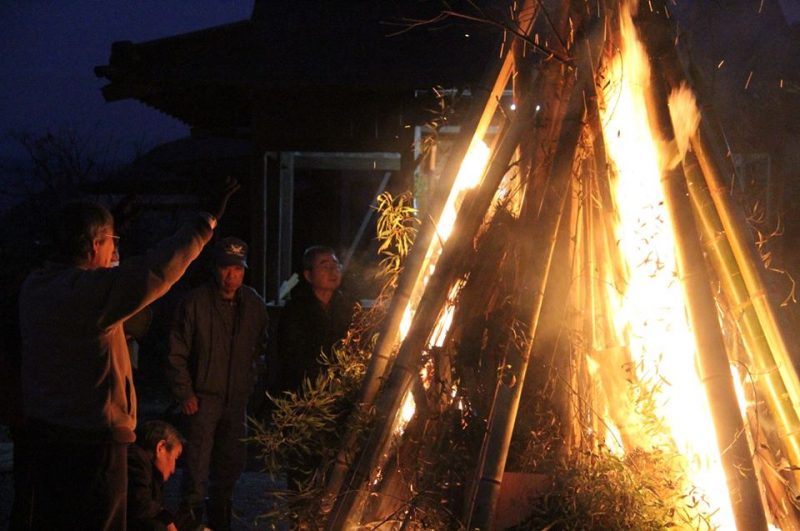 18時に点火され、赤々と燃え上がった炎が寒空を照らし出しました。地域の方々が、無病息災・厄払いなどのそれぞれの願いを込めて参拝し、火を囲みながら、振舞われたお神酒やしし汁などで体を温めました。