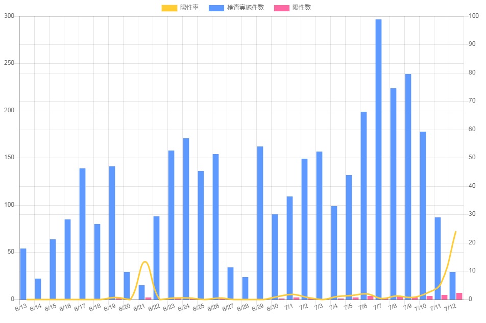 奇しくも両日ともに日曜日。毎週土日と検査数は減る傾向にあり、日曜に陽性者が判明した場合は検査数が少ないため当然、陽性率は跳ね上がります。
