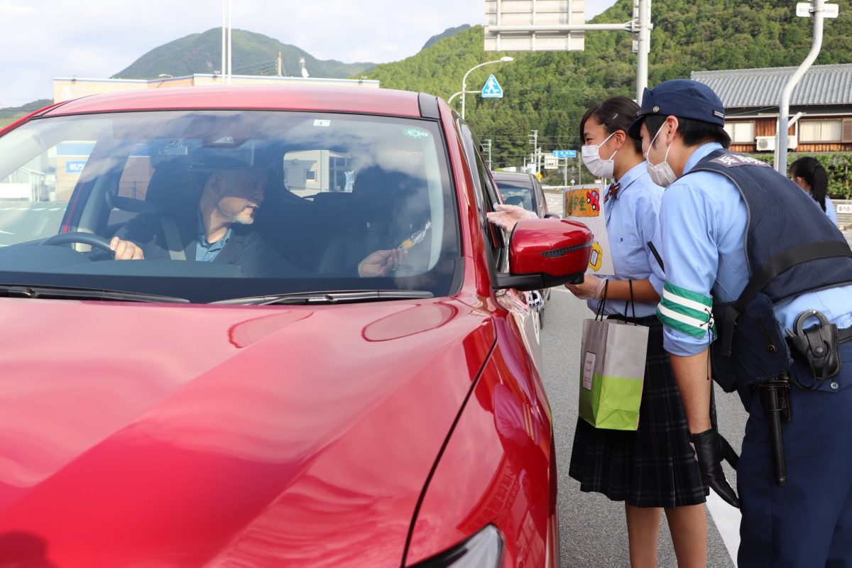 9月23日(水)夕方、公立神崎総合病院前の交差点で、神崎高等学校の生徒たちが新型コロナウイルス感染症対策をしながら、ドライバーの方々に手作りの交通安全マスコットを配布。