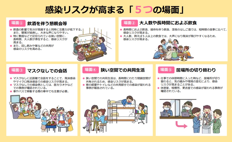 2020年前半、新型コロナウイルス感染拡大防止にあたって「3密(密閉・密集・密接)の回避」という言葉を多くの場面で見かけましたが最近なんだかよく目にする「5つの場面」というワード。