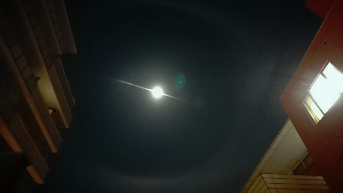 特に寒い季節の場合は雲に含まれる小さな氷の粒がプリズムのような役割をして月暈が現れますが、この日は特に雲が薄かったので、二度見してしまうぐらいにはっきりと月の輪を確認することができました。