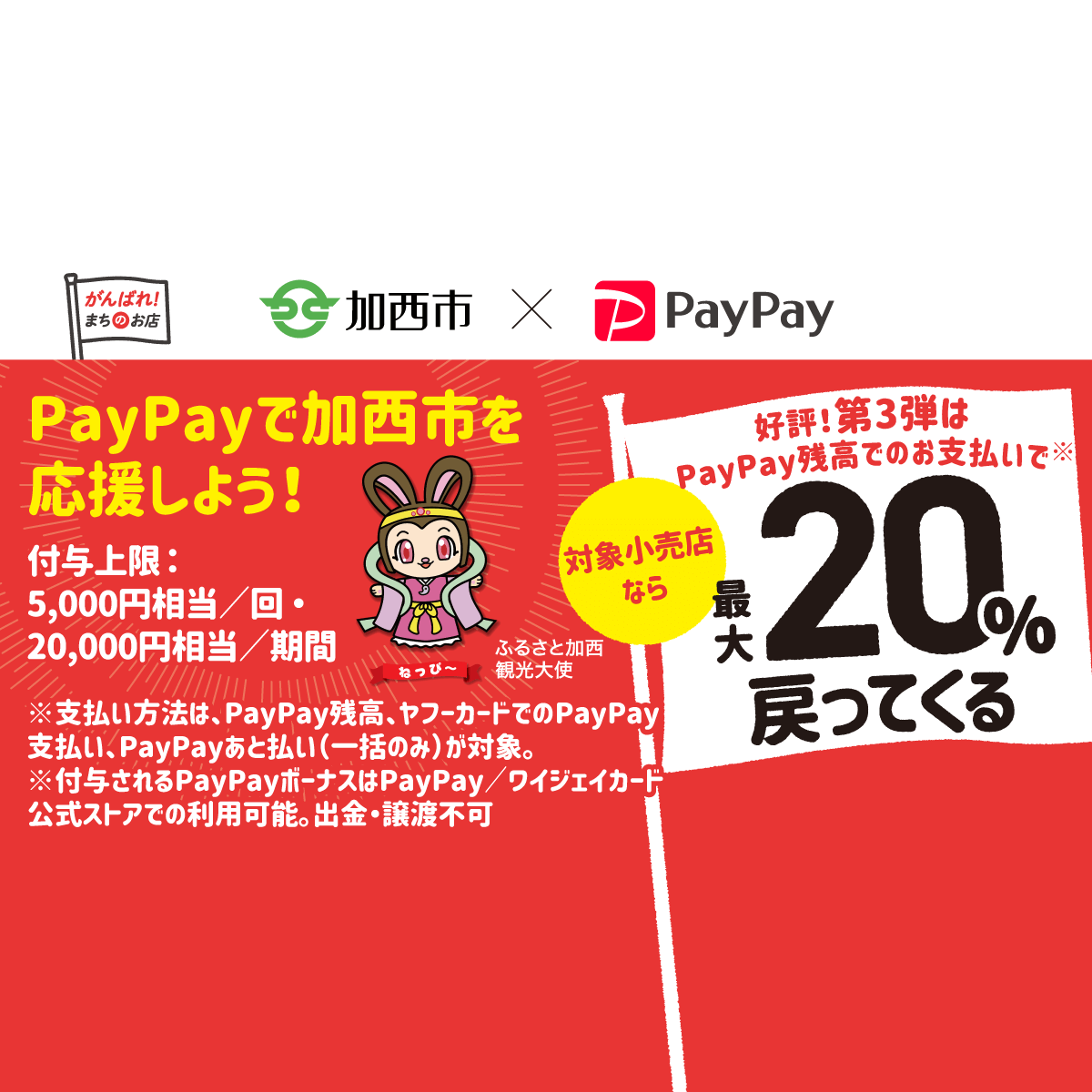 PayPay株式会社と加西市が共に取り組む「がんばれ加西!コロナに負けるな!最大20%あげちゃうキャンペーン」の第三弾が2021年2月1日(月)から2月28日(日)まで開催。