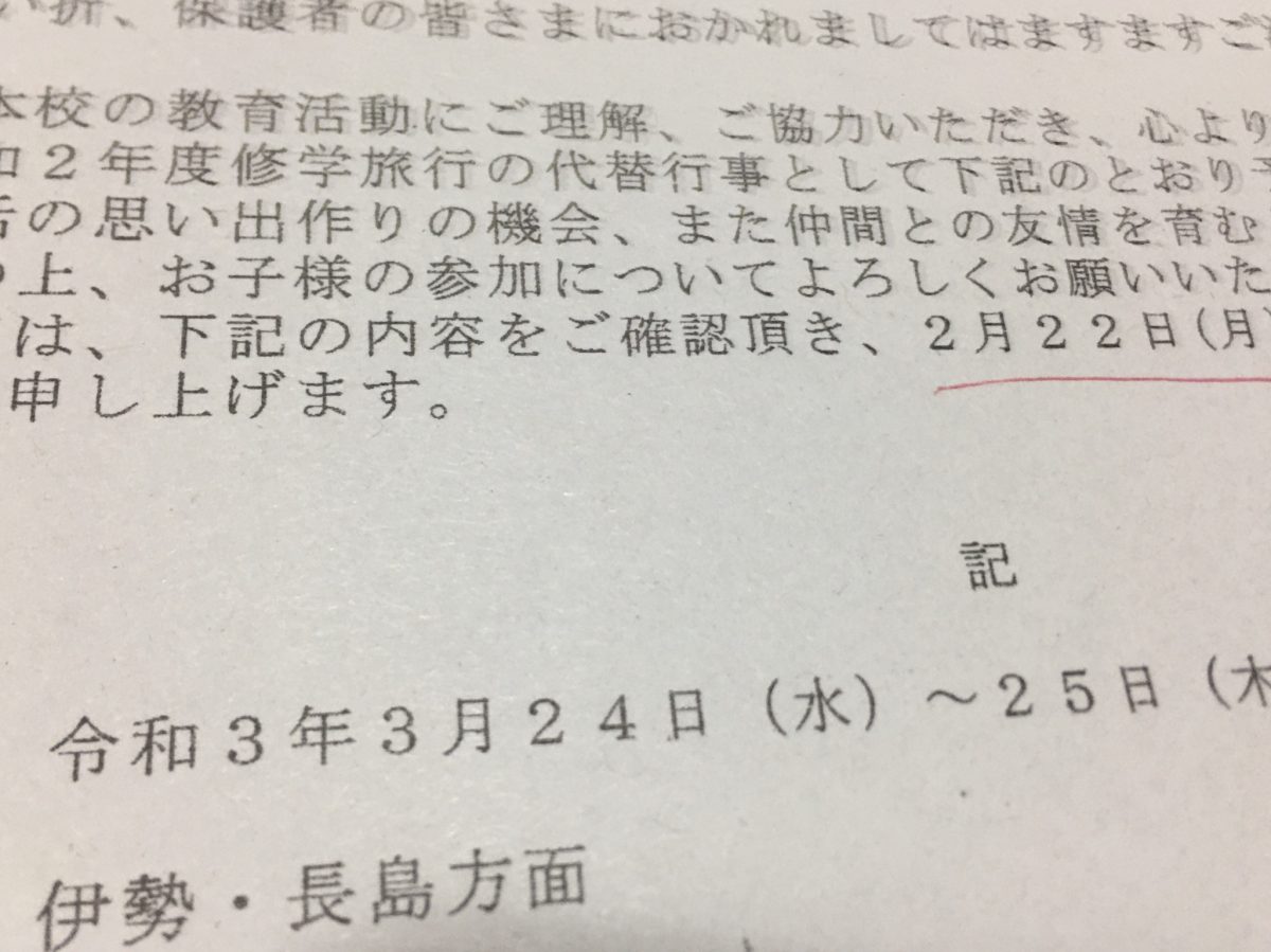 新型コロナウイルス感染拡大のため、中止となった第2学年(74回生)の北海道への修学旅行は、3月24日から25日の一泊二日の予定で三重県の伊勢、長島方面への旅行となることが決定しました。